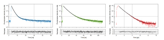 在FluoTime 300上,通過FluoMic顯微鏡對智能手機顯示屏進行觀測,采用440 nm脈沖激光激發。測量了藍色(460 nm)、綠色(522 nm)和紅色(620 nm)像素的發射衰減特性。