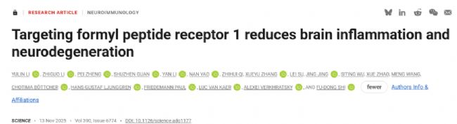 2025年11月13日,天津醫科大學總醫院/北京天壇醫院施福東教授課題組在Science期刊上發表了題名為“Targeting formyl peptide receptor 1 reduces brain inflammation and neurodegeneration”的研究論文,揭示了甲酰肽受體1(FPR1)在推動多發性硬化(MS)神經炎癥與神經退行中的核心機制。