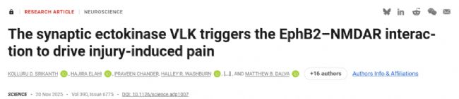 2025年11月20日,美國學者在Science期刊上發表了題名為“The synaptic ectokinase VLK triggers the EphB2–NMDAR interaction to drive injury-induced pain”的研究論文,研究揭示了細胞外磷酸化在調控突觸信號傳導與疼痛行為中的新機制。
