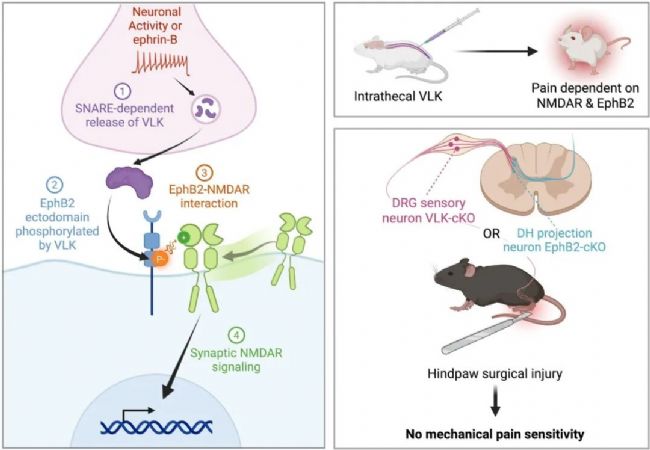 研究發現分泌型胞外激酶VLK能特異性磷酸化EphB2受體酪氨酸Y504位點,從而誘導EphB2與NMDA受體結合。VLK定位于突觸小泡,在神經元活動增強時通過SNARE依賴方式釋放至突觸間隙。在疼痛模型中,感覺神經元釋放的VLK通過激活脊髓背角投射神經元中的EphB2-NMDAR信號通路,介導機械性痛覺超敏的形成。實驗證實,特異性敲除感覺神經元中的VLK或投射神經元中的EphB2均能阻斷損傷性疼痛行為,而鞘內注射重組VLK則足以誘發疼痛樣行為。