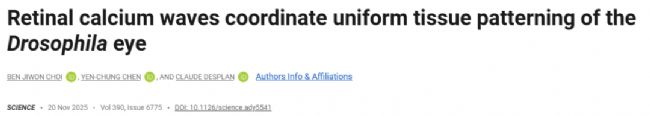 2025年11月20日,美國學者在Science期刊上發表了題名為“Retinal calcium waves coordinate uniform tissue patterning of the Drosophila eye”的研究論文,研究揭示了果蠅復眼發育過程中非神經元鈣波調控組織有序化的新機制。