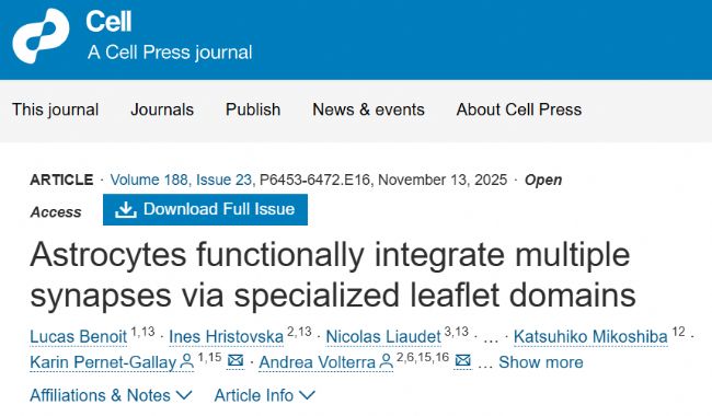 2025年11月13日,法國、瑞士、意大利、德國、日本以及中國學者聯合在Cell期刊上發表了題名為“Astrocytes functionally integrate multiple synapses via specialized leaflet domains”的研究論文,揭示了星形膠質細胞葉片狀結構在整合突觸信號中的新機制。