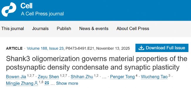 2025年11月13日,南方科技大學張明杰院士課題組在Cell期刊上發表了題名為“Shank3 oligomerization governs material properties of the postsynaptic density condensate and synaptic plasticity”的研究論文,揭示了突觸后密度(PSD)生物凝聚體的材料特性及其在突觸功能中的關鍵作用。