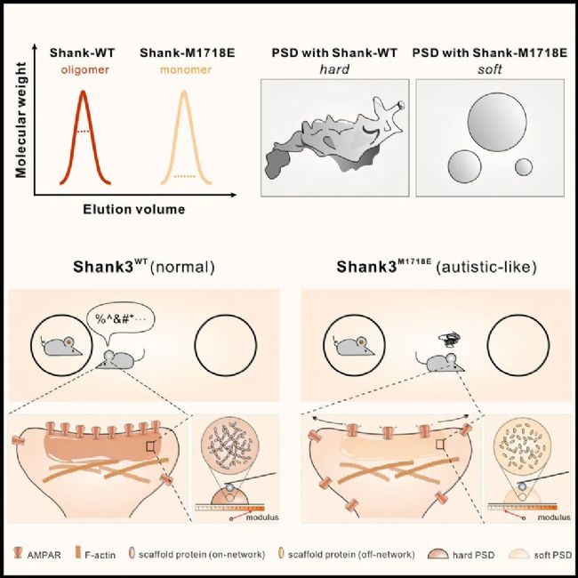 研究發現,通過相分離形成的PSD凝聚體呈現軟玻璃態材料特性,這種特性源于支架蛋白間特異性多價相互作用形成的網絡滲透。Shank3蛋白的SAM結構域介導的寡聚化對這一網絡構建至關重要,其破壞會導致PSD凝聚體軟化——在Phelan-McDermid綜合征患者中發現的SHANK3突變即產生此種效應。實驗證實,破壞Shank3寡聚化會削弱PSD網絡滲透,不僅改變凝聚體材料特性,更會損害突觸傳遞與可塑性,引發小鼠自閉樣行為。