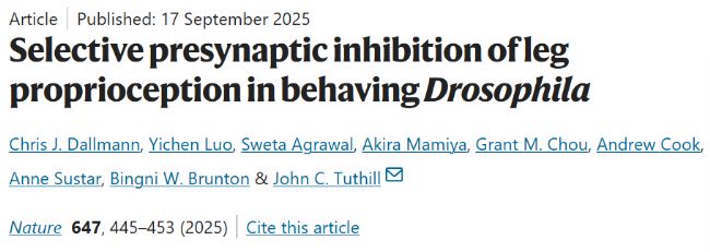 2025年9月17日,美國學者在Nature期刊上發表了題名為“Selective presynaptic inhibition of leg proprioception in behaving Drosophila”的研究論文,揭示了果蠅自發運動過程中特異性抑制本體感覺信號的神經環路機制。