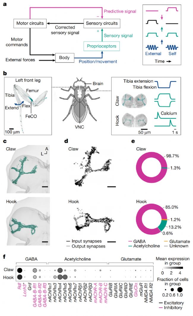 通過行為鈣成像發現,編碼腿部位置的 proprioceptors 在多種行為中持續活躍,而編碼腿部運動的 proprioceptors 在行走和理毛時被特異性抑制。結合連接組學分析,研究鑒定出一類特定中間神經元,通過GABA能突觸前抑制作用于運動編碼型 proprioceptors 的軸突。這些中間神經元接收來自并行下行通路的興奮性與抑制性輸入,能以情境特異性和腿部特異性的方式被激活。鈣成像證實該環路僅在對自主生成的腿部運動(而非被動運動)時激活。