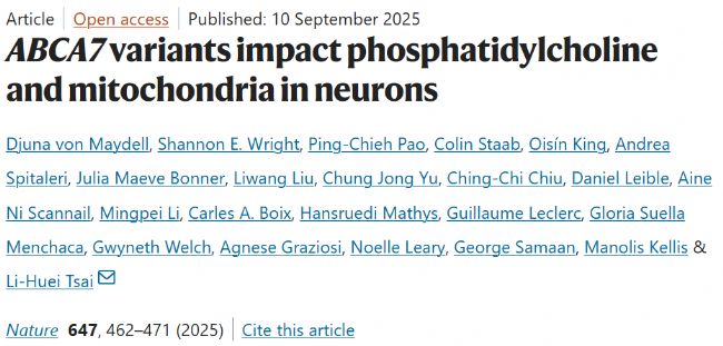2025年9月10日,美國以及意大利學者聯合在Nature期刊上發表了題名為“ABCA7 variants impact phosphatidylcholine and mitochondria in neurons”的研究論文,揭示了ABCA7功能缺失變異通過破壞磷脂酰膽堿代謝介導阿爾茨海默病風險的機制。