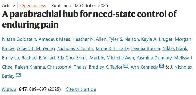2025年10月8日,美國學者在Nature期刊上發表了題名為“A parabrachial hub for need-state control of enduring pain”的研究論文,揭示了臂旁核中表達Y1神經肽受體的神經元群體在持續性疼痛調控中的核心作用。