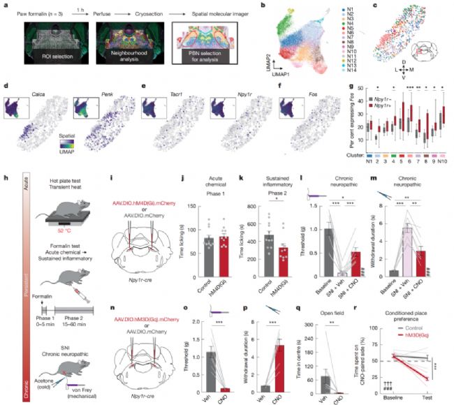 通過空間轉錄組學與神經調控技術,發現組織損傷后臂旁核Y1R神經元活性持續升高,且其活動水平可預測個體的功能代償行為。研究證實饑餓、口渴或天敵線索等生理需求能通過釋放神經肽Y抑制Y1R神經元活動,從而廣泛抑制不同類型損傷引發的持續性疼痛。這種需求狀態驅動的鎮痛效應不依賴于組織愈合狀態,揭示了內源性鎮痛系統通過特定神經元集群實現多模態感覺整合的新機制。