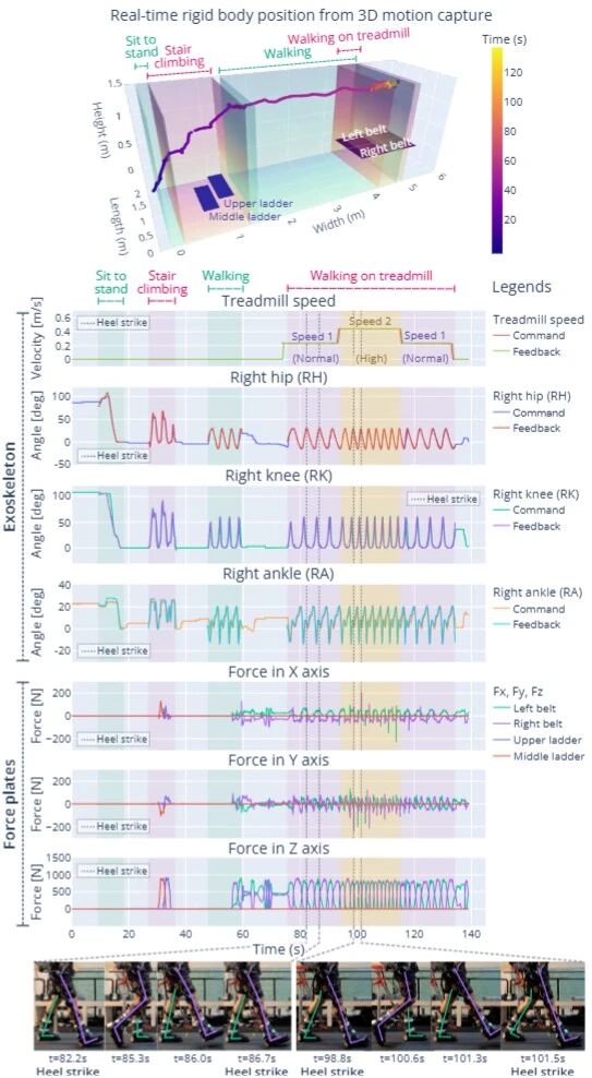研究人員通過測試,驗證了VISTEC-GAIT的有效性和功能性。演示視頻見文末,實時記錄數據見圖 3。圖中呈現了閉環外骨骼步態輔助實驗的多個階段數據(含坐站轉換、爬樓梯、正常行走、不同速度下的跑步機行走等場景)。結果顯示,外骨骼能輔助受試者完成多種活動,且能根據操作員設定的跑步機速度變化自動適配步態模式。