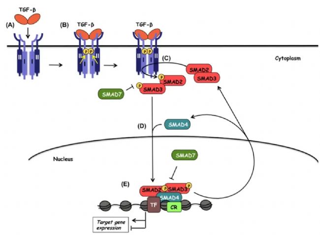 TGF-β家族成員涵蓋TGF-β1/2/3、BMP、Activin等多種配體,其信號啟動依賴與細胞膜上II型受體(TβRII)和I型受體(TβRI)的特異性結合,形成異四聚體復合物。首先由II型受體激酶磷酸化I型受體的GS結構域,激活其內在激酶活性,完成信號起始的關鍵步驟。