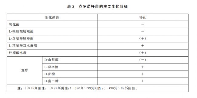 3、確證實驗:將可疑菌落接種 TSA平板后進行生化鑒定?梢允紫辱b定克羅諾桿萌顯色培養基平板上最具特征性的菌落接種的 TSA 平板上的菌落。如果是陽性,則不需要測試其他TSA 平板上的菌落。如果是陰性,則選取其他 TSA 平板上的菌落進行鑒定,直到全部為陰性或發現陽性菌落為止。為確保結果的準確性,對 TSA 平板上的菌落進行鑒定時,應使用新鮮的傳代菌落?肆_諾桿菌的主要生化特征見表3。