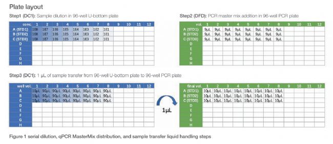 本次qPCR實(shí)驗(yàn)采用 TaqMan™ 基因表達(dá)預(yù)混試劑(Applied Biosystems, Cat. 4369016),以濃度為 108 ng/mL 的陽(yáng)性病毒對(duì)照作為起始樣本,在 apricot DC1 自動(dòng)化液體處理工作站上,于 96 孔 U 底板中完成陽(yáng)性對(duì)照的連續(xù)梯度稀釋。每個(gè)稀釋度設(shè) 3 個(gè)復(fù)孔。具體操作流程如下: