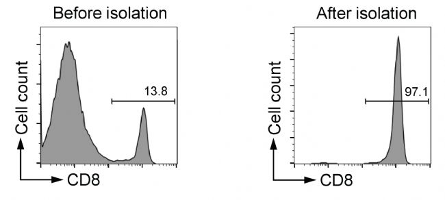 C57BL/6小鼠脾臟細胞中分選CD8+ T細胞,分選前后的細胞用FITC anti-mouse CD8抗體(克隆號53-6.7)標記后進行流式細胞儀分析。分選前后的CD8+ T細胞純度分別為13.8%和97.1%。