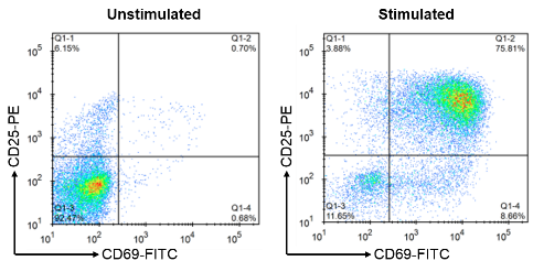 使用人CD3/CD28 T細胞激活磁珠,刺激CD3+ T細胞24到48小時,細胞用FITC anti-human CD69抗體(克隆號FN50 )和PE anti-human CD25抗體(克隆號BC96)標記,進行流式細胞儀分析。刺激前后CD25+ CD69+ T細胞占總細胞的比例分別為0.70% 和75.81%;T細胞-Day5-細胞增殖明顯。