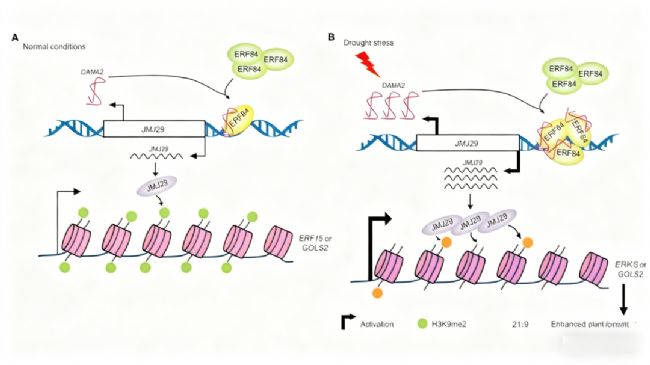 JMJ29作為組蛋白H3K9去甲基酶,通過去除ERF15和GOLS2基因座的H3K9me2標記激活其表達遺傳證據顯示,dana2、erf84和jmj29突變體均表現干旱敏感表型
