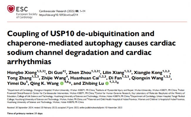 基于此,武漢大學(xué)中南醫(yī)院心內(nèi)科魯志兵教授團(tuán)隊(duì)與華中科技大學(xué)生命科學(xué)與技術(shù)學(xué)院王擎教授團(tuán)隊(duì)合作,在Cardiovascular Research發(fā)表題為“Coupling of USP10 de-ubiquitination and chaperone-mediated autophagy causes cardiac sodium channel degradation and cardiac arrhythmias”的研究論文。