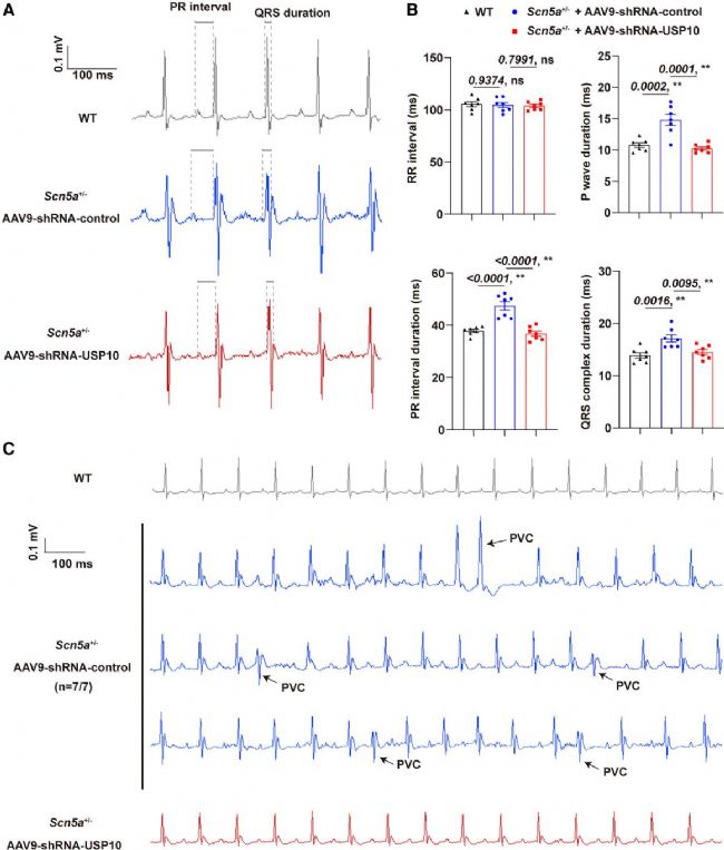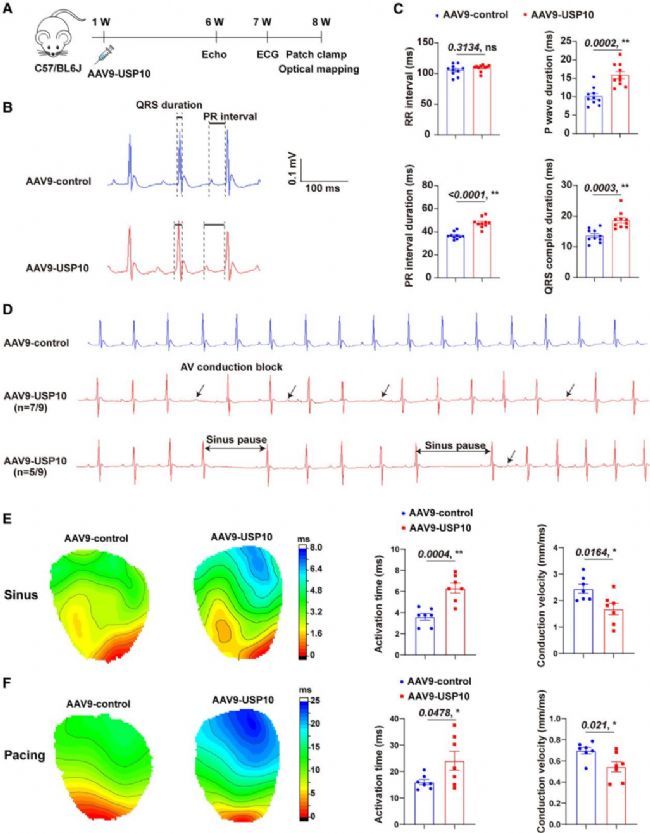 圖2. USP10過表達(dá)導(dǎo)致小鼠心臟傳導(dǎo)阻滯
