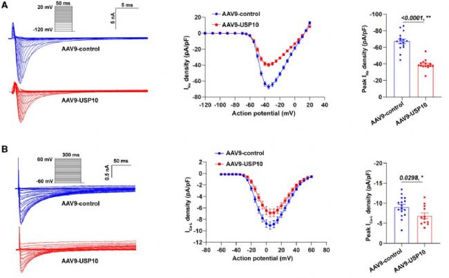 研究分離USP10過表達(dá)的小鼠成年心室心肌細(xì)胞,檢測(cè)其離子通道電流與動(dòng)作電位:全細(xì)胞電壓鉗顯示,小鼠心肌細(xì)胞INa密度顯著降低且失活閾正向偏移,晚INa無變化,ICa-L密度降低但激活/失活特性不變,Ito、IK1、Iss無組間差異;在表達(dá)人源鉀通道的HEK293細(xì)胞中,USP10也不影響人類Ito、IKr特性。動(dòng)作電位檢測(cè)發(fā)現(xiàn),靜息膜電位無差異,但APA、Vmax、APD90和APD50均降低,提示INa降低與傳導(dǎo)異常相關(guān),ICa-L減少或致APD降低。此外,USP10過表達(dá)顯著降低小鼠心臟Nav1.5蛋白表達(dá),而相關(guān)心律失常離子通道基因mRNA表達(dá)無差異。