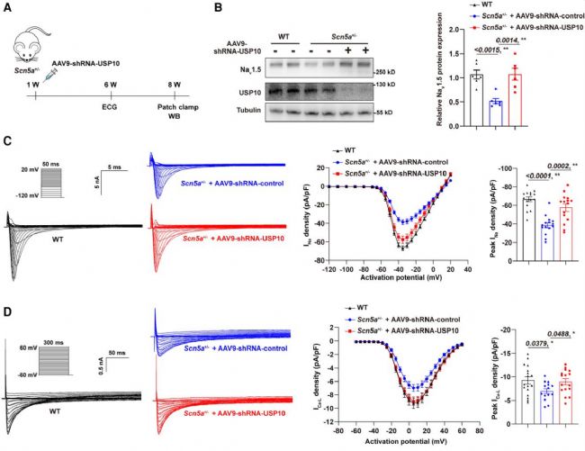 4. 敲低USP10可恢復(fù)Scn5a+/−小鼠的鈉電流減少及心律失常