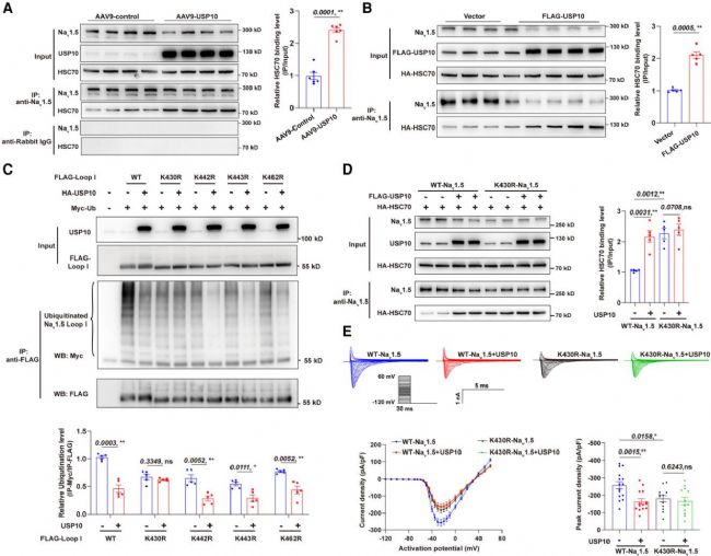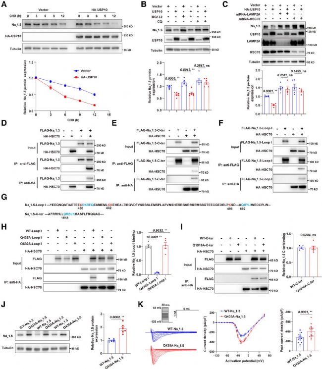 研究探究USP10促進(jìn)Nav1.5的CMA降解機(jī)制:因Nav1.5的 EKRFQ431-435基序緊鄰USP10結(jié)合位點(diǎn)K430,推測(cè)其影響 Nav1.5與HSC70的結(jié)合,實(shí)驗(yàn)證實(shí)過表達(dá)USP10可顯著增強(qiáng)二者結(jié)合。進(jìn)一步發(fā)現(xiàn)USP10 能降低Nav1.5泛素化水平,經(jīng)突變實(shí)驗(yàn)驗(yàn)證,K430是其去泛素化的關(guān)鍵位點(diǎn),K430R突變可阻斷該作用,還能抑制USP10對(duì)Nav1.5表達(dá)及INa密度的下調(diào)效應(yīng),揭示了去泛素化與 CMA偶聯(lián)降解Nav1.5的新機(jī)制。