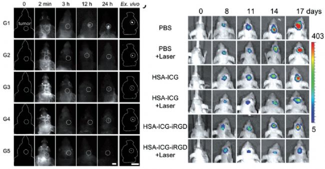圖1 HSA-ICG-iRGD 在原位膠質瘤小鼠體內主動靶向 NIR-Ⅱ成像和光熱治療的示意圖[3]