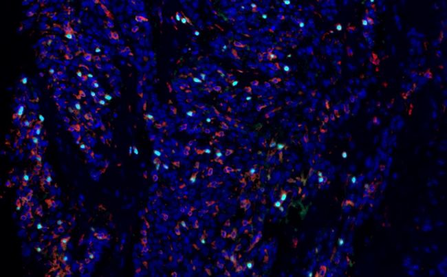愛必信mIHC實驗結果:Treg(CD4 紅+Foxp3 青色)