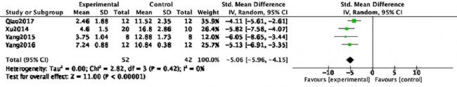 癲癇行為:4項臨床前研究納入行為學分析,固定效應模型薈萃分析顯示,taVNS 組對癲癇動物行為的改善效果顯著優于對照組,且異質性低 (I²=0%)(圖4)。