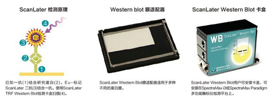 ScanLater Western Blot試劑盒包括從轉膜到檢測的所有試劑,目前有三種選擇:抗兔、抗鼠和鏈霉親和素。每一種試劑盒內,都包含了Eu標記的二抗、封閉液和洗液三種試劑,所有的試劑盒都已經在MD SpectraMax i3和SpectraMax Paradigm多功能讀板機上進行過驗證。