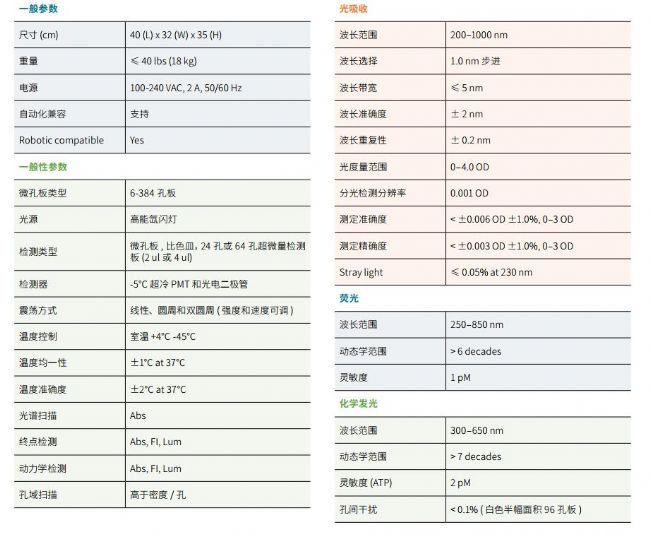 • 支持 6-384 孔板檢測,多達 3 種檢測功能,包括全波長光吸收,熒光和化學發光