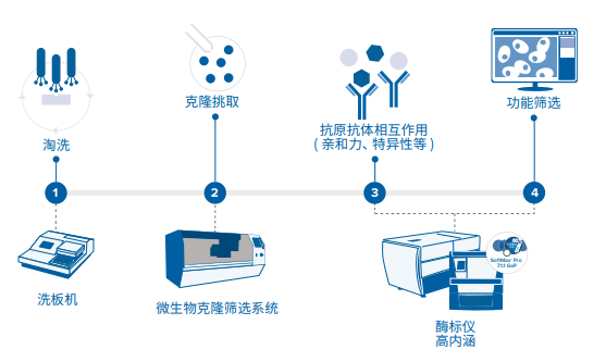 噬菌體展示通常用于發現抗體和抗原之間的高親和力相互 作用,這在病毒發病機制、疫苗和其他治療中起著關鍵作 用。QPix XE 可用于提高篩選克隆的通量,從而增加識別高 親和力結合物的機會。
